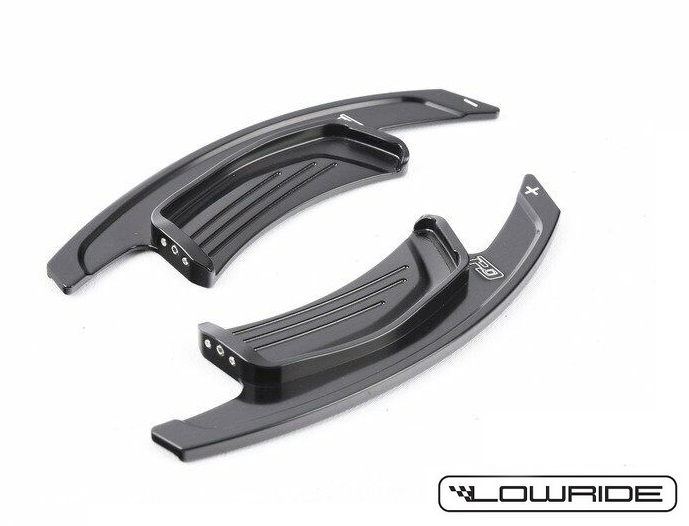 Zestaw sportowych manetek/łopatek zmiany biegów automatycznej skrzyni S-Tronic Audi / DSG / Tiptronic, renomowanej amerykańskiej firmy LEYO Motorsport w kolorze czarnym V3. Łopatki montowane na seryjne, bardzo małe manetki.