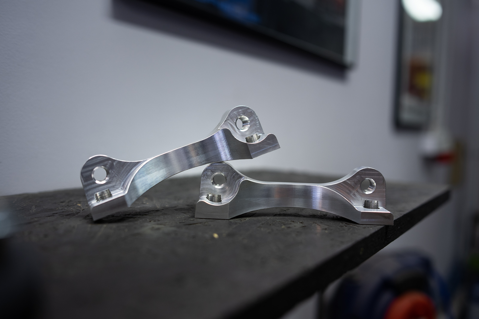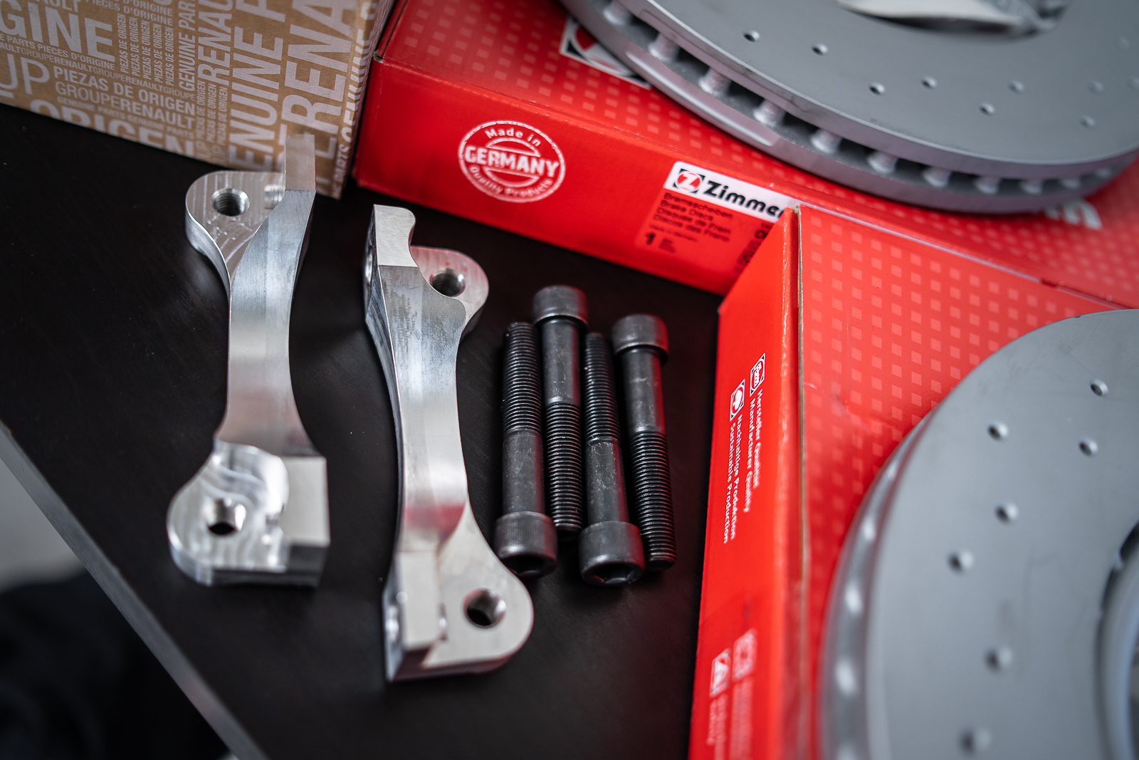 Adaptery umożliwiające zamontowanie 4ro tłoczkowych zacisków hamulcowych BREMBO na przedniej osi. Przygotowane do współpracy z tarczami hamulcowymi o średnicy 337 mm i grubości 30 mm (zarówno zaciski 4ro tłokowe jak i dużo większe, od seryjnych tarcze hamulcowe powodują, że układ hamulcowy jest dużo skuteczniejszy i wydajniejszy od seryjnego).