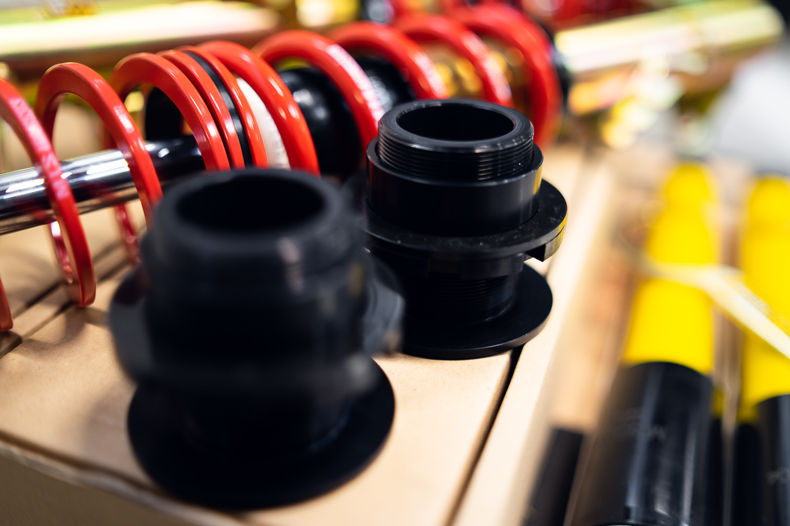 Każdy dostarczany zestaw, nie jest wyposażony w górne poduszki amortyzatorów. Przy montażu, zarówno przednich, jak i tylnych kolumn należy zamontować w pierwszej kolejności górne mocowania amortyzatorów. W przypadku BMW E36 na tylne amortyzatory oprócz górnej poduszki należy zamontować również odboje i osłony przeciwpyłowe. (Jeśli te części w Twoim oryginalnym zawieszeniu są bez usterek, można je wykorzystać. Jeśli tak nie jest, warto zaopatrzyć się w nowe górne poduszki amortyzatorów)