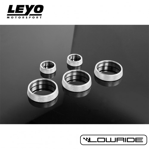 Zestaw aluminiowych pokręteł obsługi radia oraz panelu klimatyzacji renomowanej amerykańskiej firmy LEYO Motorsport w kolorze srebrnym. Pierścienie montowane na seryjne pokrętła.