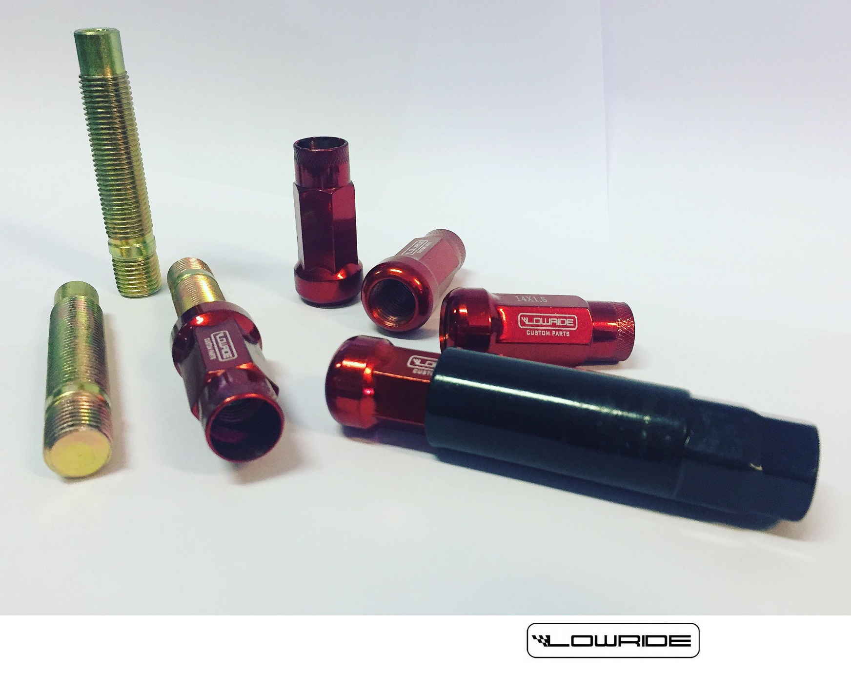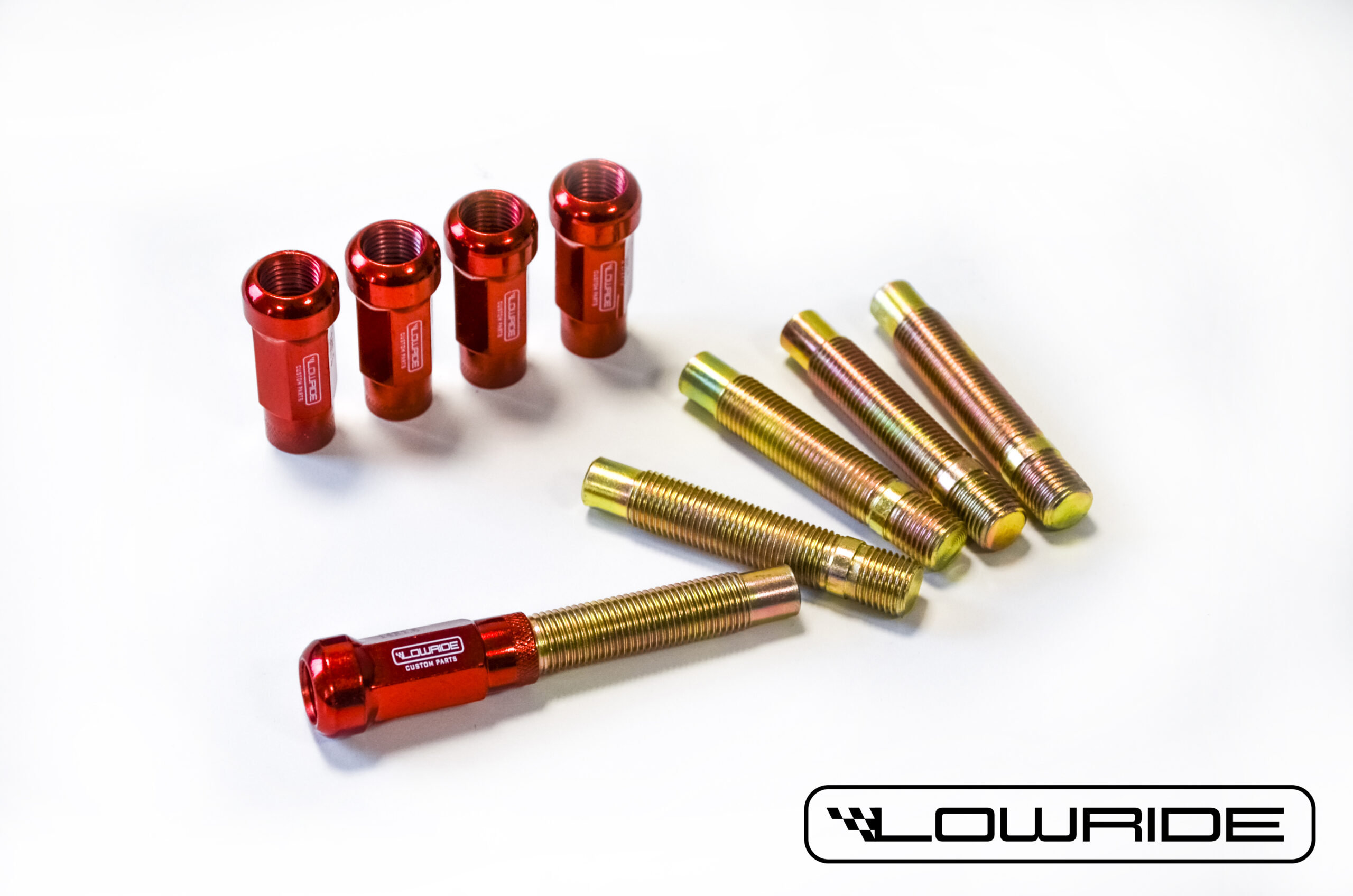 Zestaw długich szpilek/śrub dwustronnych zastępujących fabryczne śruby kół wraz z długimi nakrętkami – gwint M14x1,5 kulowe gniazda nakrętek.